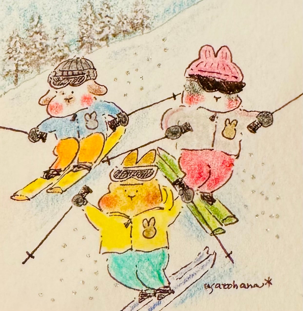 【うさぎのむう】スキー!好きー!(原画) 手描きイラスト 絵 雑貨 贈り物 プレゼント | うさぎのむう【イラストと雑貨】
